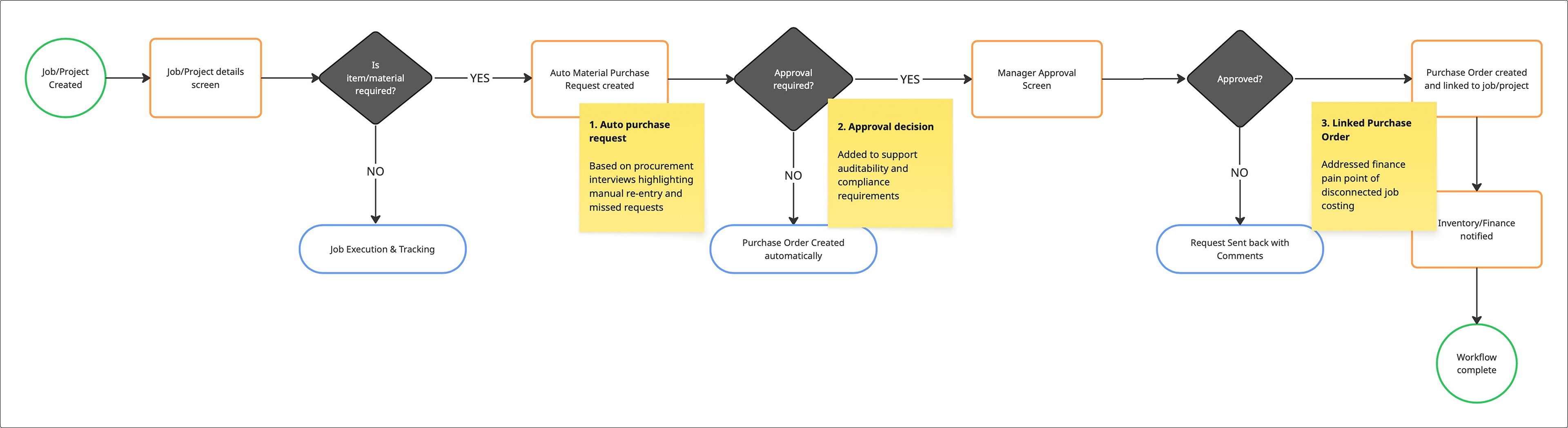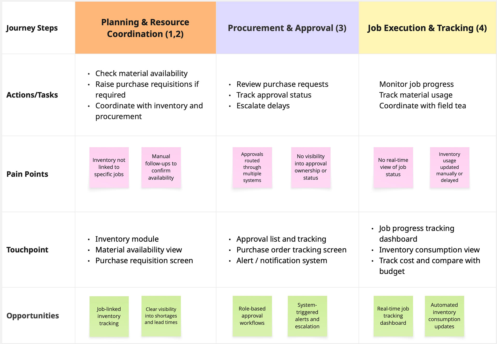 Synthesized research into end-to-end workflow maps across Planning, Procurement, Execution, and Finance—aligning user goals, system responsibilities, and approvals. Business objectives such as efficiency, cost control, auditability, and scalability were embedded into each flow. Features were prioritized by workflow impact, and a high-level, role-aligned information architecture was defined to support scalable design.