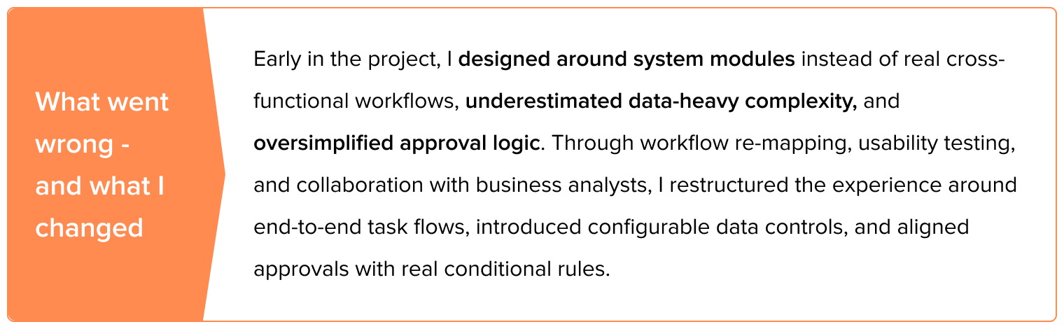 Post-launch, the ERP was successfully rolled out, replacing fragmented tools with a cohesive digital platform. This led to reduced manual reconciliation, faster onboarding and approvals, quicker requisitions, and significantly improved operational visibility. This confirmed that a user-centered, strategic approach to enterprise design can drive trust and adoption, even in complex environments.