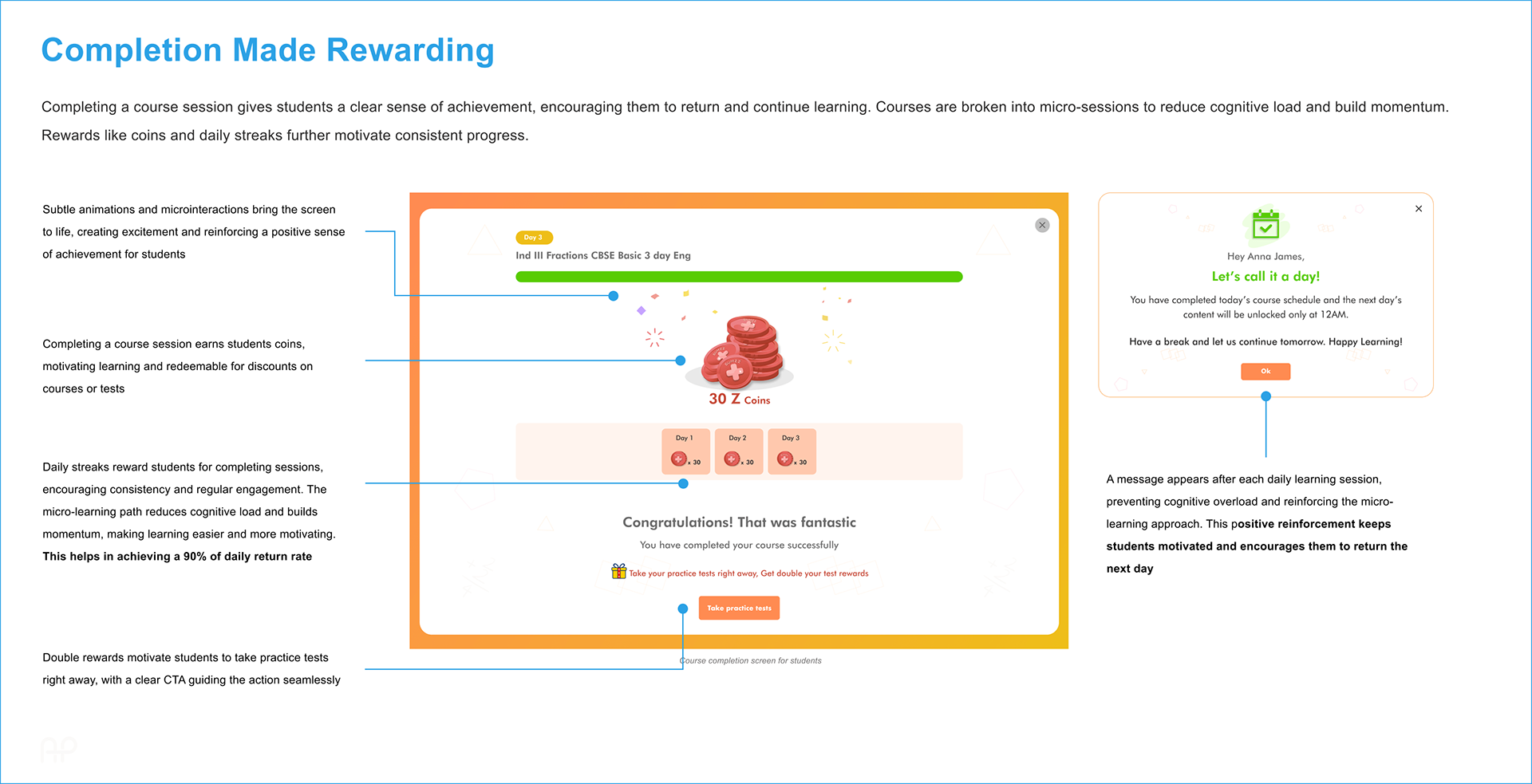 ✅ Achieved a 90% daily return rate, ensuring consistent learner engagement